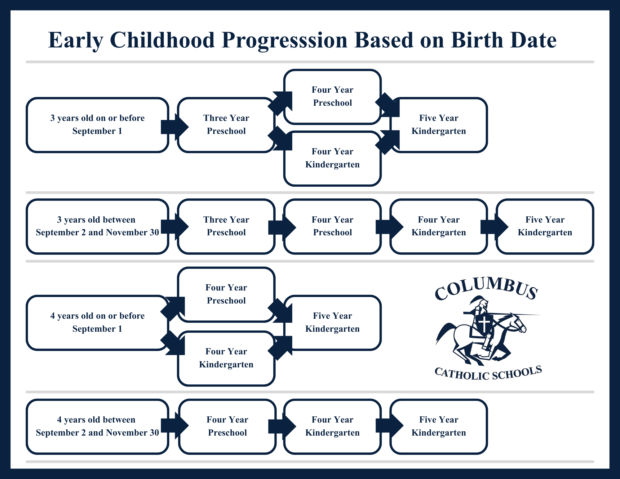 Three Year Preschool → Four Year Preschool → Four Year Kindergarten → Five Year Kindergarten - 4 years old on or before September 1: