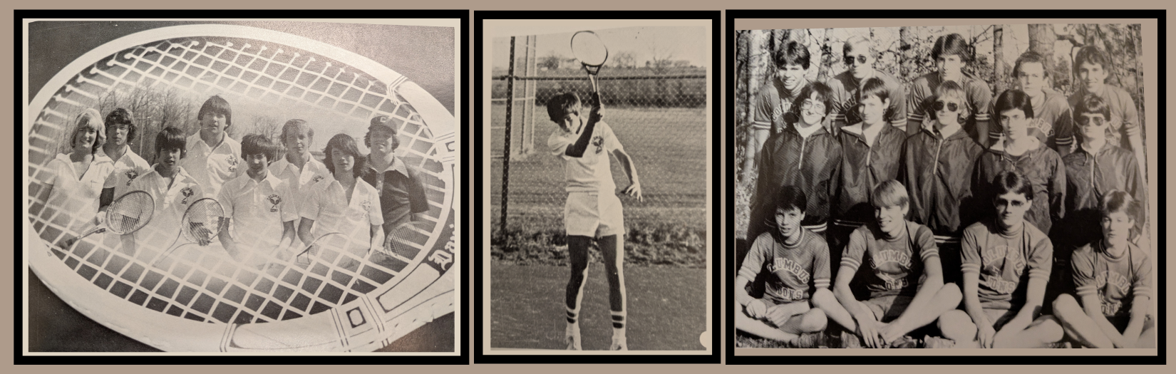 Caption: LEFT: The 1978 Tennis Team included Mary Beyerl, John Ptacek, Keith Koenig, Al Michalski, Bill Eggebrecht, Brad Lindner, Gary Haley, and Coach Gary Hallowell MIDDLE: Concentration is the name of the game, as Bill Eggebrecht completed the upward swing of his forehand shot. RIGHT: The 1985 Cross Country members included (front) Terry Huettl, Brooks Holtey, Tim Moen, Darren Brost, (middle) Bill Miller, Don Hasenhorl, Chris Drews, Chuck Meyer, Nathan Jansen, (back) Jeff Wolf, Mike Sadowski, Andrew Mork, Jim Nystrom, and Steve Heinzen.
