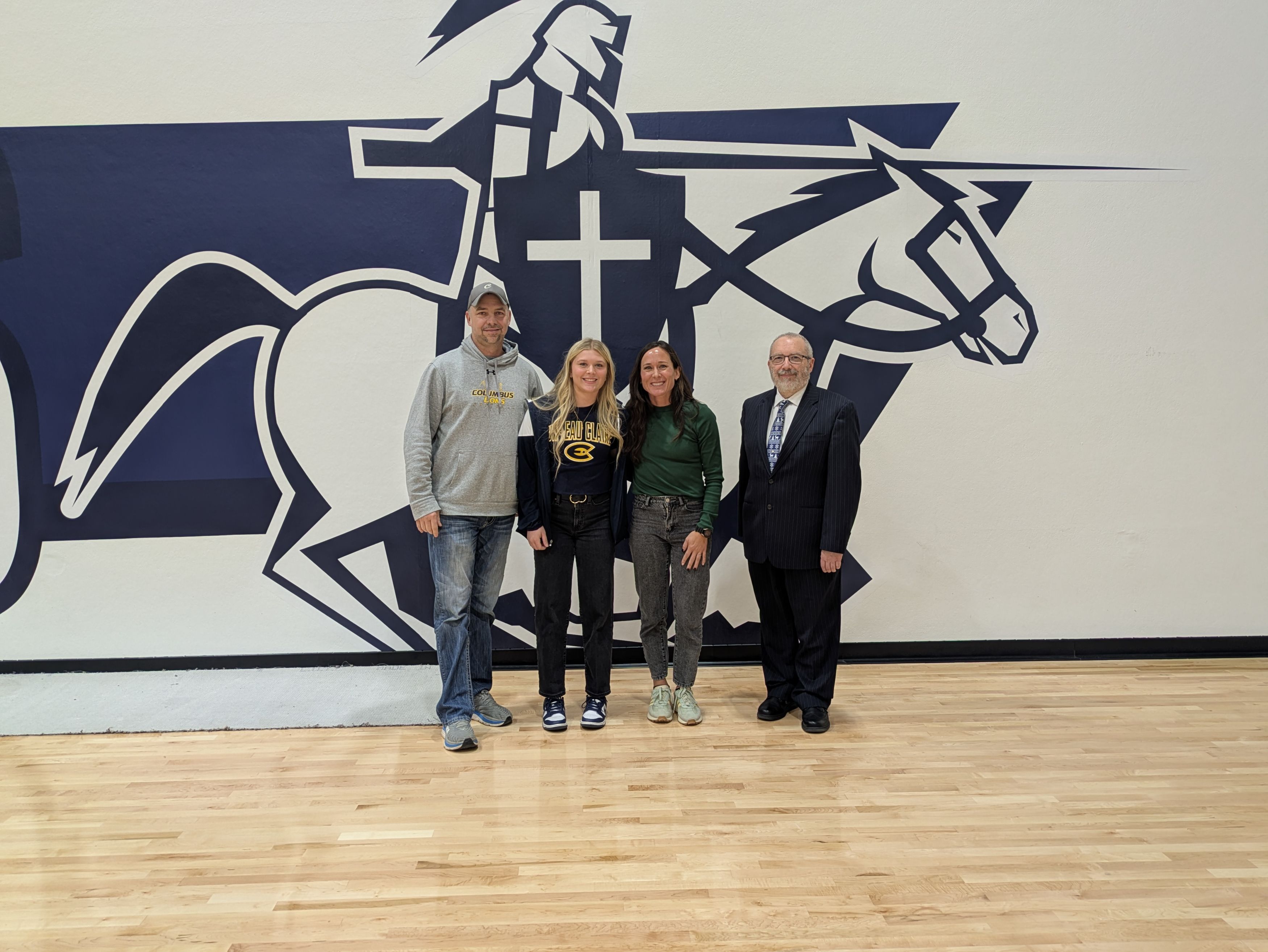 Caption: Columbus Catholic senior Shelby Spata is joined by head softball coach Troy Zimmermann, athletic director Lori Wieland, and Columbus Catholic Schools president David Eaton following her signing to play softball at the University of Wisconsin–Eau Claire.