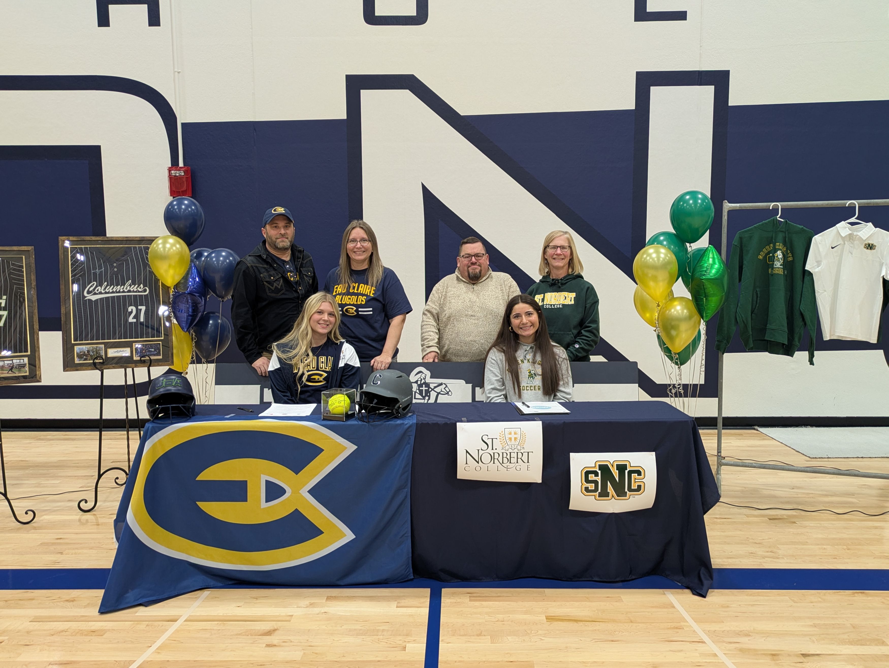 Caption: Columbus Catholic seniors Shelby Spata (softball, UW–Eau Claire) and Jaylee Garneau (soccer, St. Norbert College) are joined by their parents following their signing ceremonies on November 12, 2025, at Columbus Catholic High School.